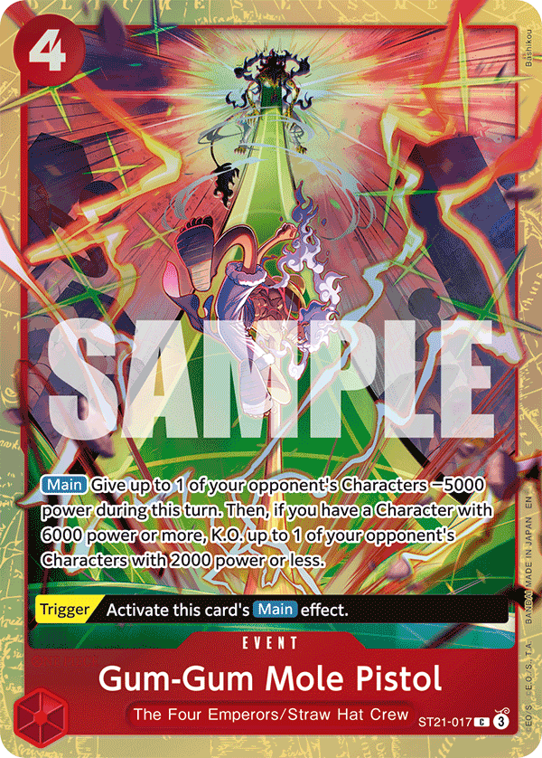 [Main] Give up to 1 of your opponent's Characters −5000 power during this turn. Then, if you have a Character with 6000 power or more, K.O. up to 1 of your opponent's Characters with 2000 power or less.